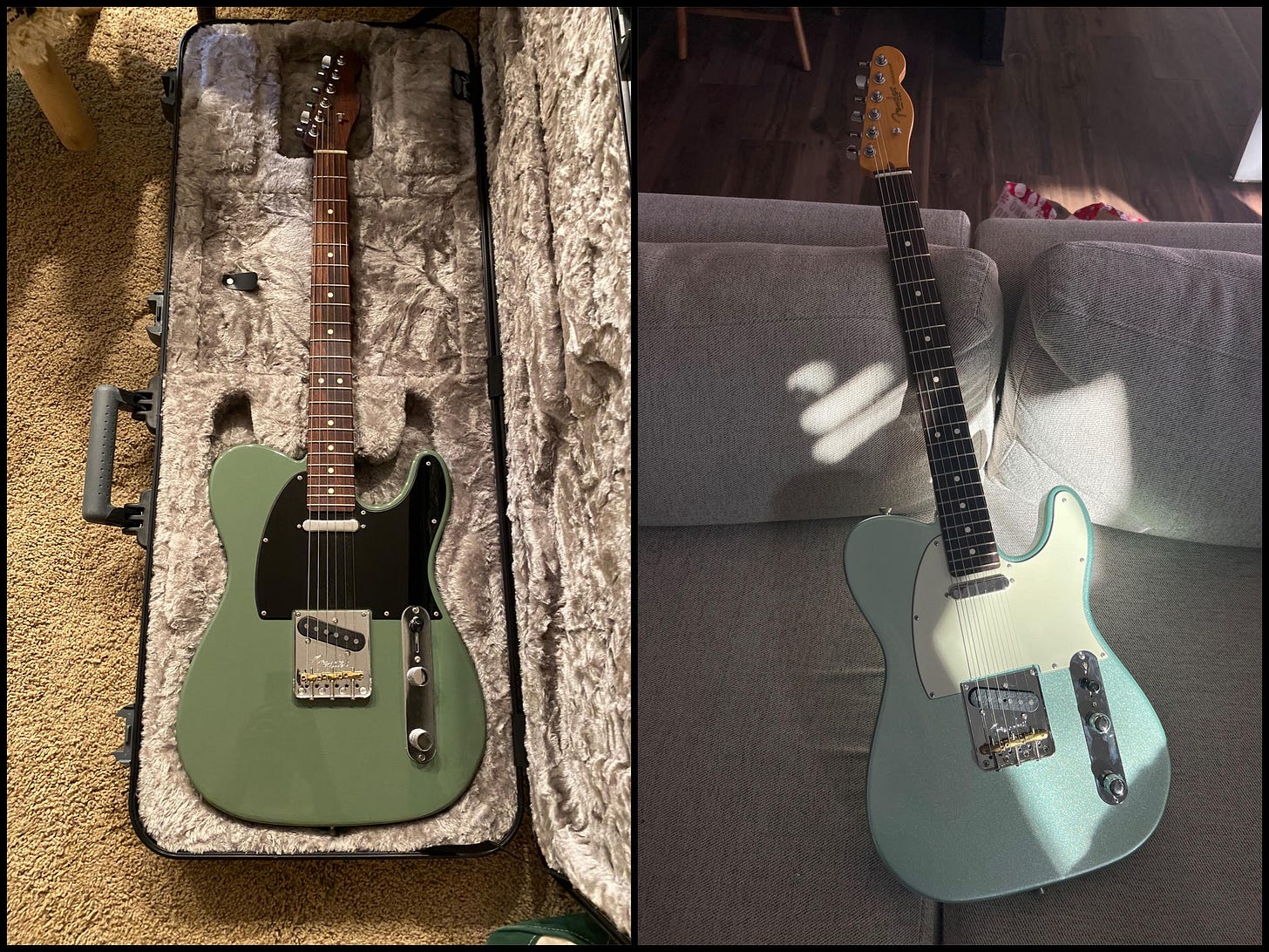 Mitch: I’m also a guitarist. Similar story: I started on acoustic lessons, got bored with that as a kid, and then started to get into classic rock. The first song I learned on electric was Tom Petty’s Mary Jane’s Last Dance. After college I went back to acoustic because it’s more fun when you’re just playing solo. But I always wanted a Fender Telecaster—specifically in surf green with the cream white pickguard—and my wife got it for me for Christmas (shoutout to Kara wife of the year). So I’ve been back on electric this past month.